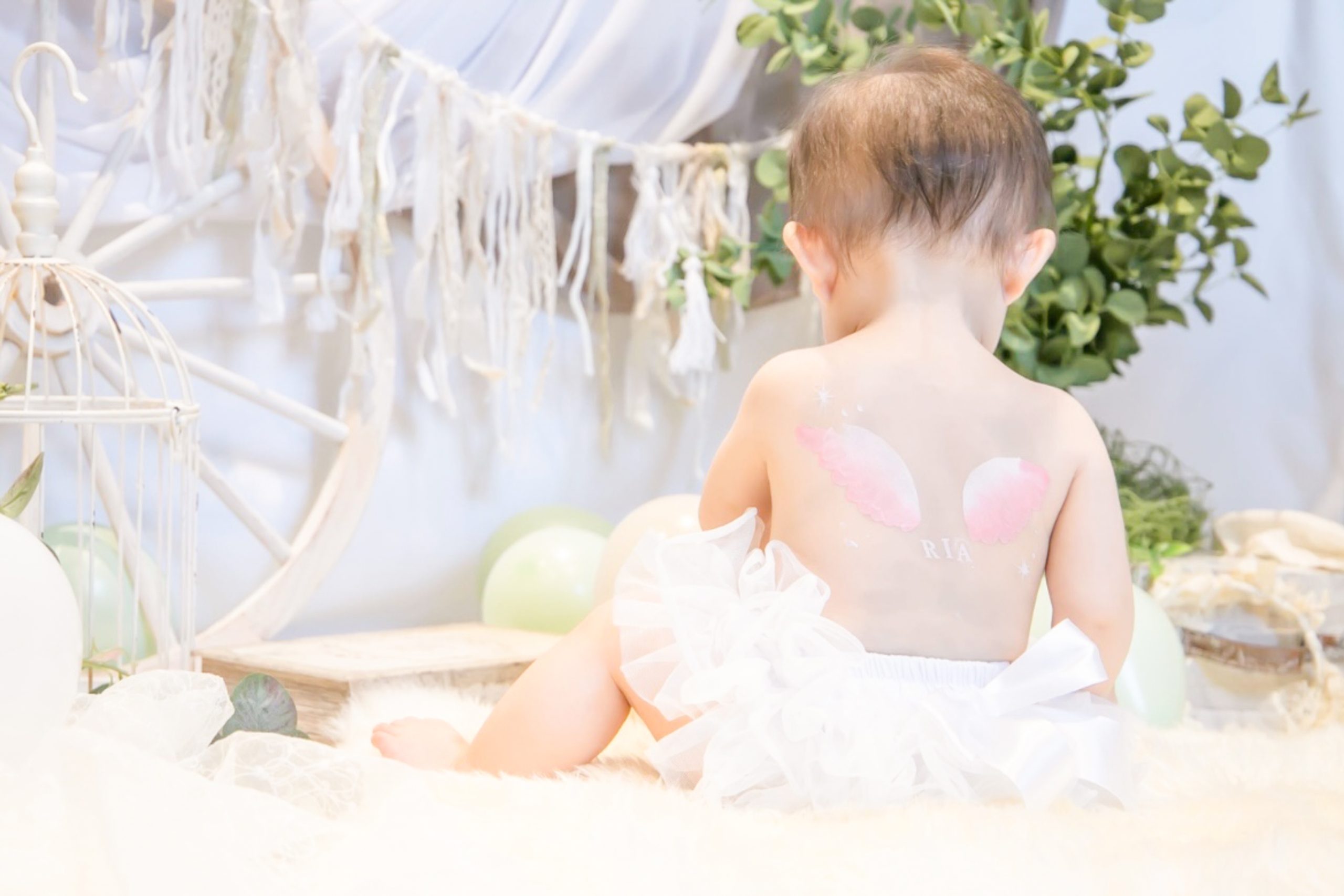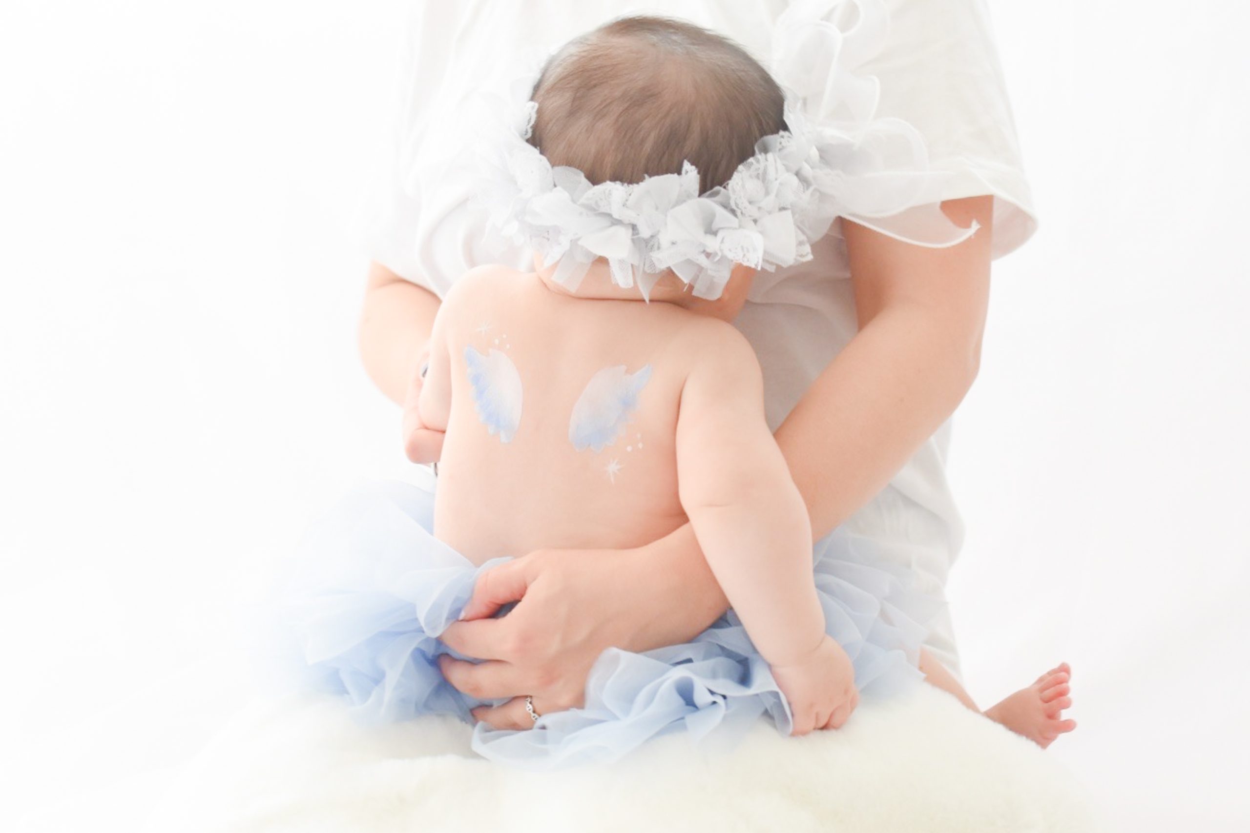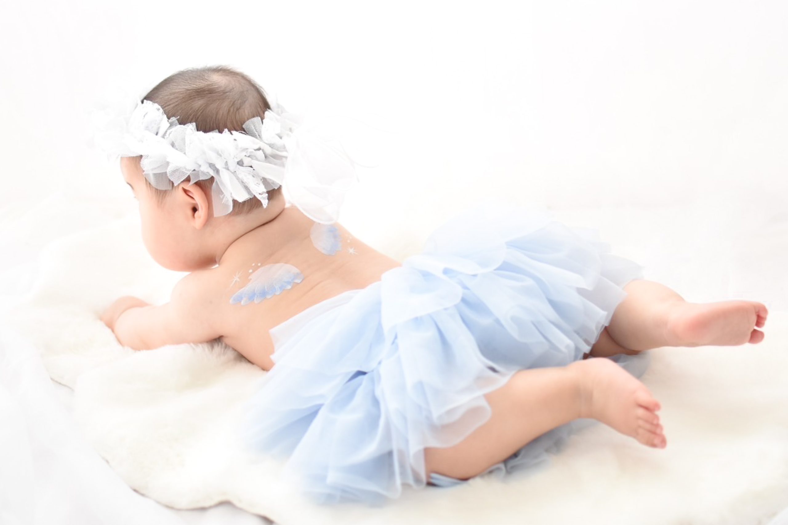 赤ちゃんの背中にペイントアーティストが天使の羽を短時間で描きます。赤ちゃんの身体にやさしい安全な絵の具を使用しますのでご安心ください。撮影後はウェットティッシュなどで簡単に落とすことができます🎨